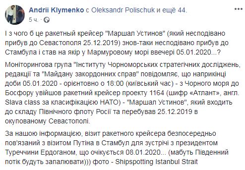 "Мониторинговая группа "Института Черноморских стратегических исследований", редакции и "Майдана иностранных дел" сообщает, что в конце суток 05.01.2020 - ориентировочно в 18:00 (киевское время) - с Черного моря в Босфор вошел ракетный крейсер проекта 1164 (шифр "Атлант" , англ. Slava class по классификации НАТО) - "Маршал Устинов", который входит в состав Северного флота России и находился 25.12.2019 в оккупированном Севастополе", - говорится в сообщении.