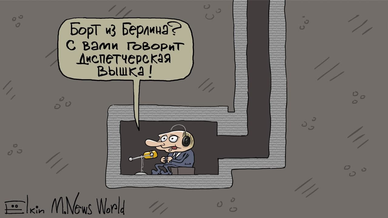 "Борт из Германии? С вами говорит диспетчерская вышка", - от имени Путина написано на картинке.