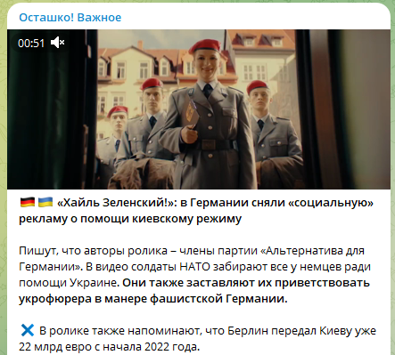 В конце видео появляется титр, сообщающий, что из бюджета Германии на войну в Украине отправлено более 22 миллиардов евро.