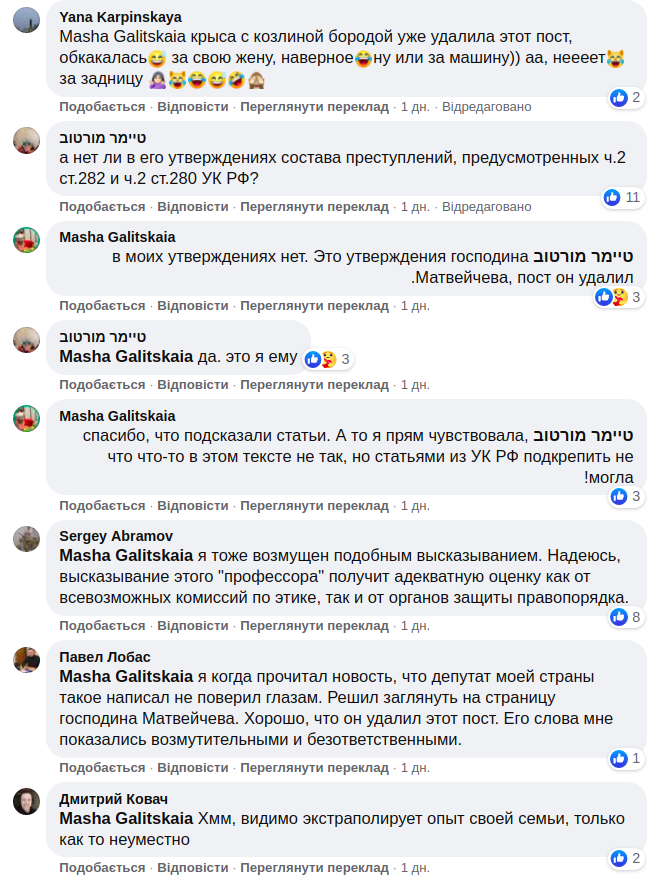 Однако спустя сутки он извинился за свое высказывание: "По сути, мое обращение было… по форме неудачное. Оно было оскорбительным даже, и за это оскорбление я прошу прощения у всех, кого это задело, тем более, у тех, кто не причастен к какой-то поддержке", - цитируют Матвейчева РИА Новости.