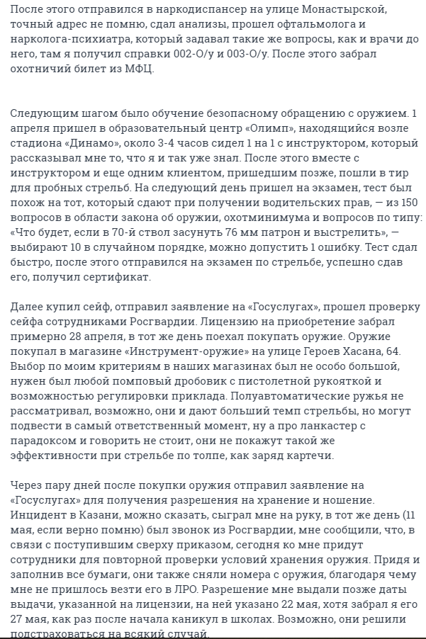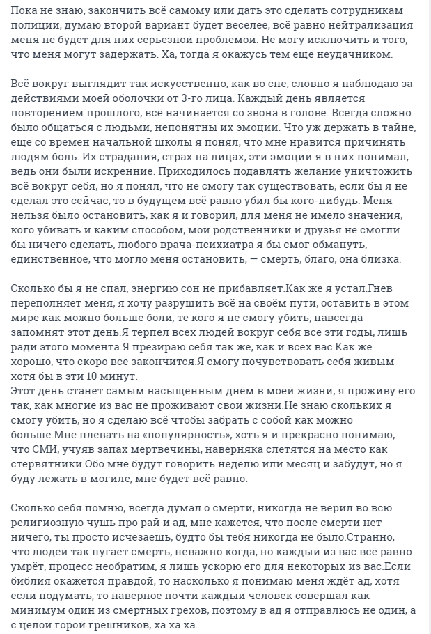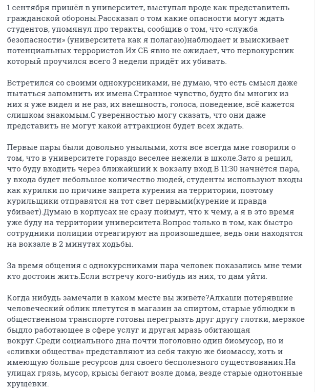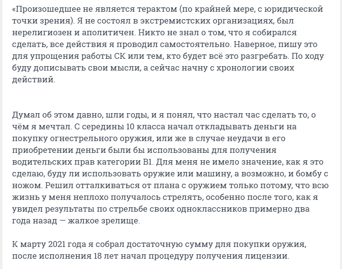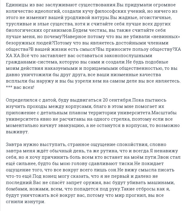 "Я заприметил этот ВУЗ еще во времена когда ходил в него на курсы в 9 классе, мне понравилось большое количество корпусов и соответственно студентов, есть где разгуляться, да и сама локация выглядит неплохо, куда лучше, чем гнилые хрущевки вокруг. Не самое худшее место чтобы умереть", - написал стрелок.