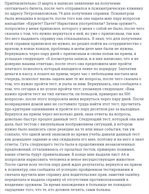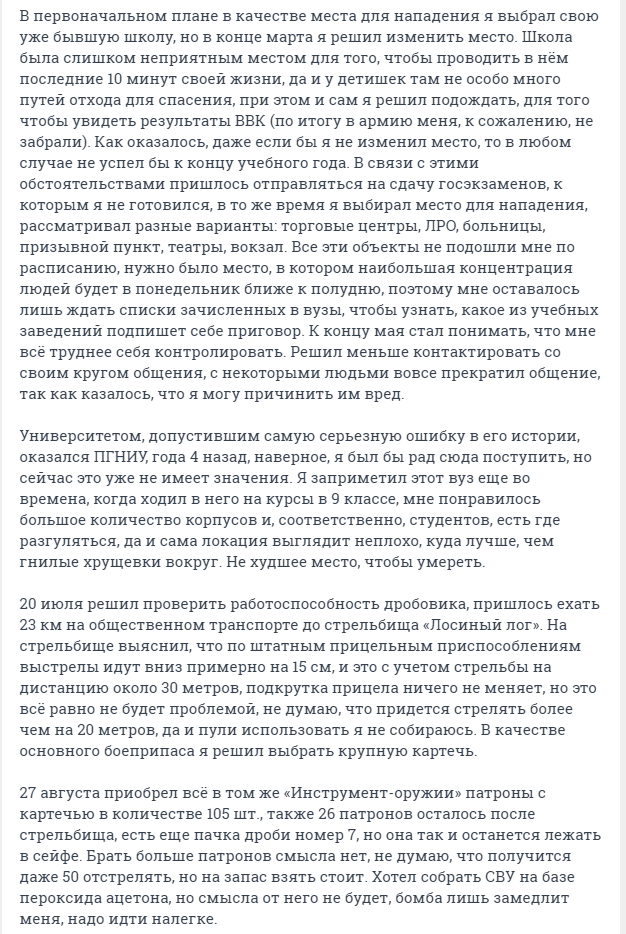 Издание 59.RU нашло страницу в соцсетях, где стрелок поэтапно рассказывает, как собирался устроить стрельбу.