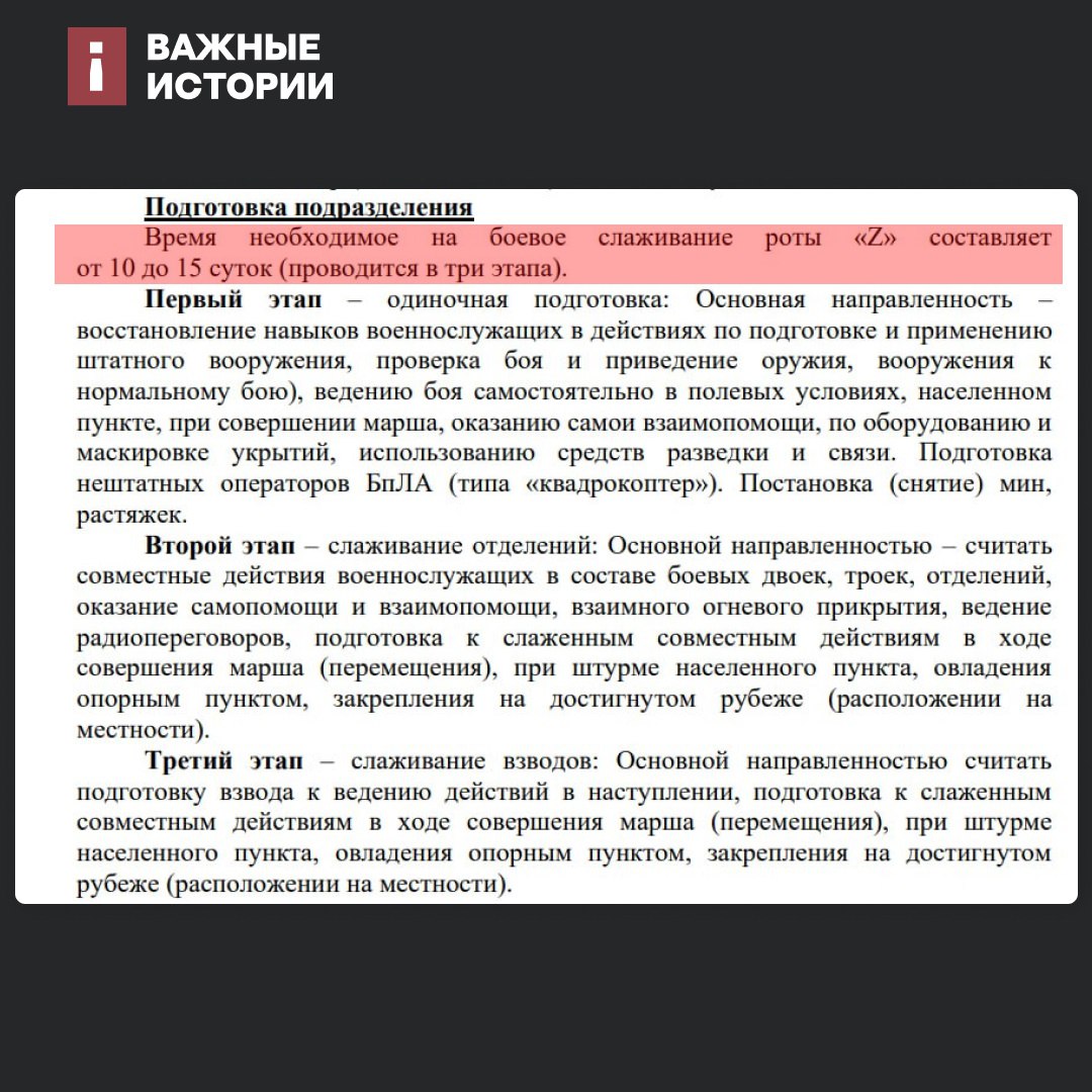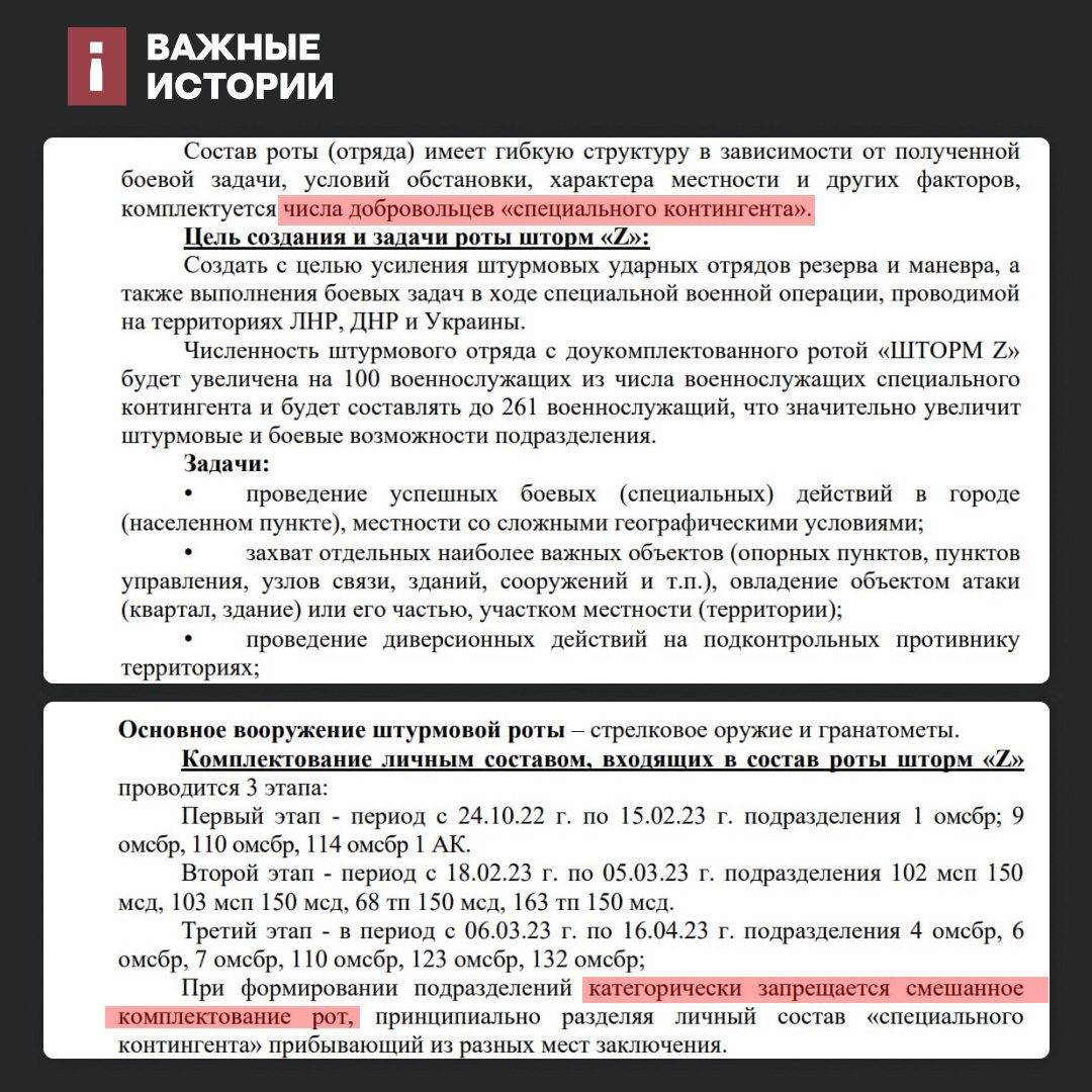 Положение Минобороны РФ "Об штурмовых ротах Z" гласит, что роты или отряды "шторм Z" формируются только из заключенных, при этом "спецконтингент", то есть бывшие осужденных из разных мест заключения нельзя смешивать не только с другими военнослужащими, но и между собой.