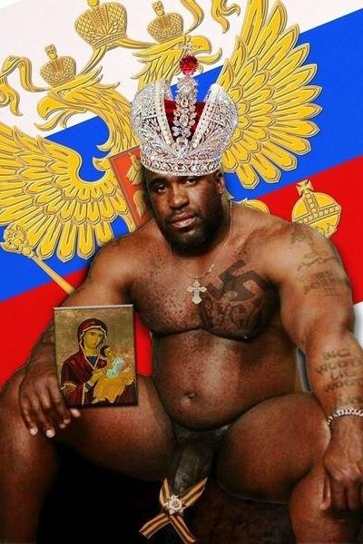 В среду, 12 февраля, изображение темнокожего татуированного мужчины, сидящего на фоне флага России со свастикой на груди и георгиевской ленточкой на пенисе все еще присутствует на сайте "Луркоморье".