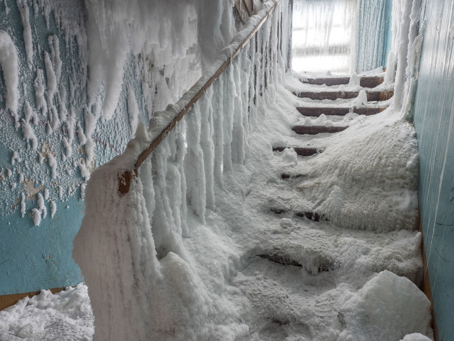 В подписи к снимкам говориться, что в этом угольно добывающем регионе уменьшилось вдвое количество рабочих шахт, поэтому тысячи людей покидают промышленные города и поселки, бросая на произвол судьбы огромные жилые кварталы советских времен. Каждую зиму снег и лед покрывают то, что раньше было жилыми комнатами, офисами и спальнями людей.