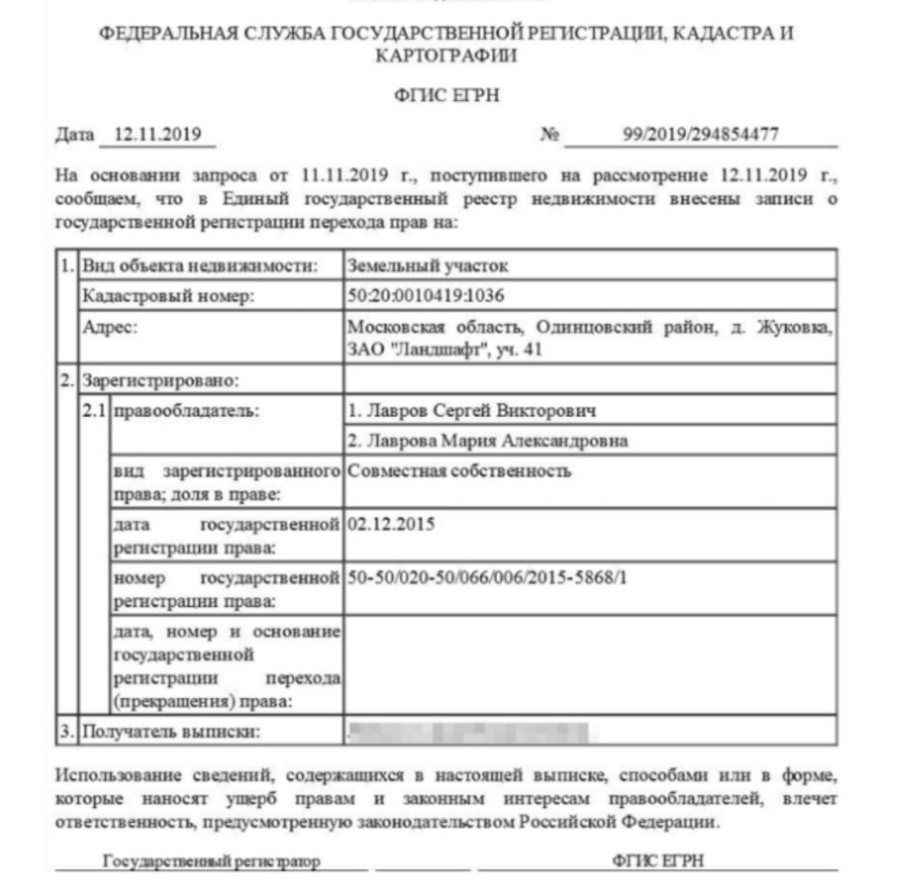 Трехэтажный особняк площадью 499 кв. м. расположен на участке в 28.4 сотки в элитном поселке Жуковка Одинцовского района Московской области. Зарегистрирован на Сергея Лаврова и его жену Марию в декабре 2015 года. Стоит такая недвижимость около 300 млн российских рублей. Это - 66 годовых доходов семьи Лавровых, если принимать во внимание суммы в их налоговой декларации.