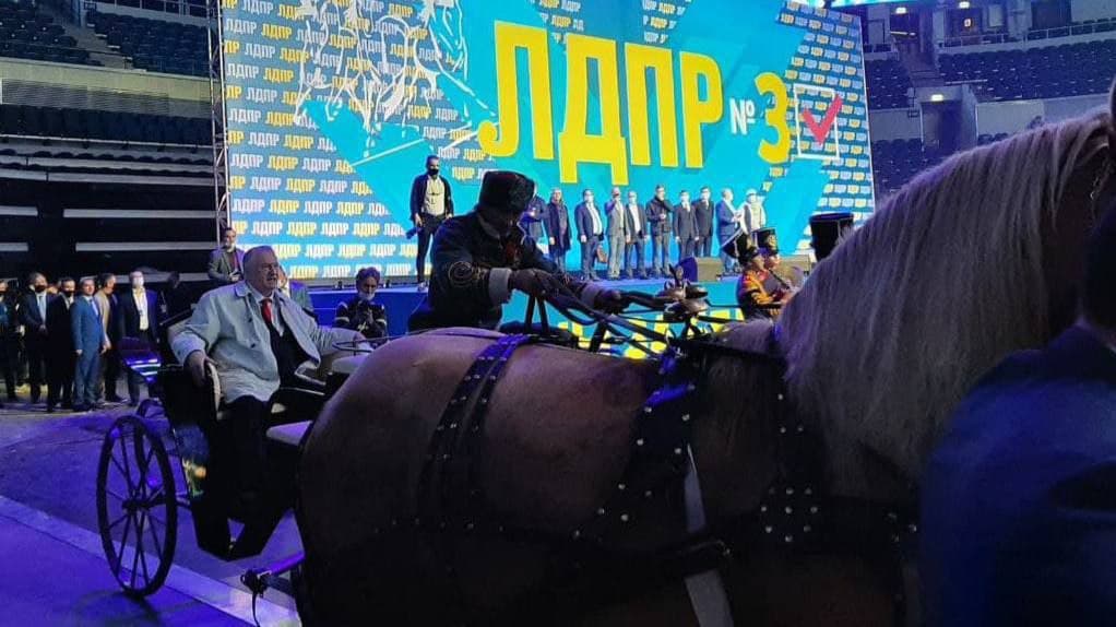 Лидер ЛДПР и скандальный российский депутат Владимир Жириновский, также известный как "клоун" Путина, порадовал соцсети новой эпатажной выходкой. Он приехал на съезд партии на тройке лошадей, которые обгадили арену.