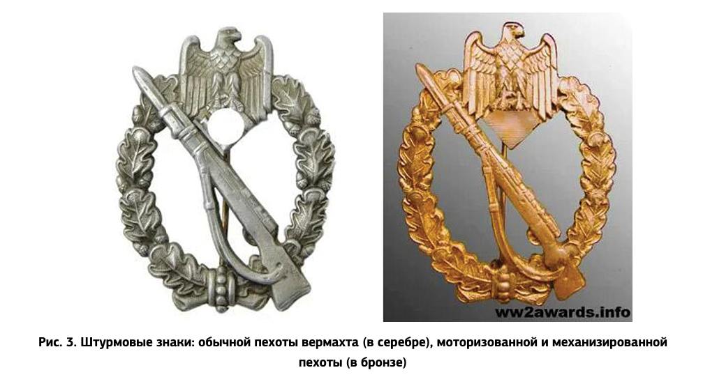 Там отмечают "острую необходимость" в знаках, которые бы выдавались штурмовикам по решению командиров "на поле боя". Мол, в вермахте вопрос наград был отлично продуман и находился на тщательном контроле, а для штурмовиков выдавали ведомственное отличие - штурмовой знак пехоты.