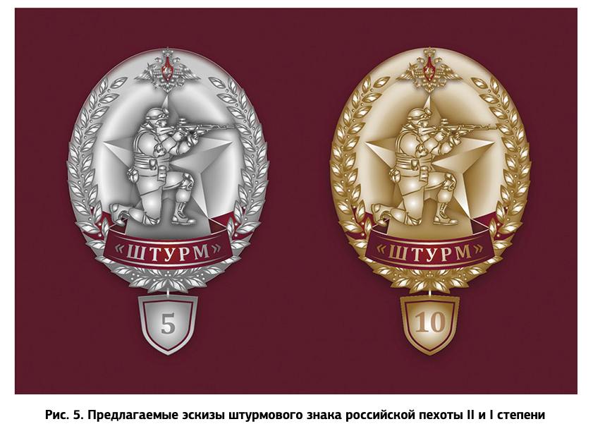 "Нам кажется, что большое количество штурмовых действий войск в ходе специальной военной операции в Украине требует и у нас ввести ведомственный знак ВС РФ - штурмовой знак российской пехоты, который должен вручаться бойцам командирами полков и бригад по их решению прямо на поле боя, а уже затем оформляться бюрократически. Эту же награду можно вручать штурмовикам другого ведомственного подчинения... Бойцы с гордостью носили ее, поскольку награда была наглядным свидетельством мужества и отваги награжденного... и доказательством его военного мастерства", - отмечают авторы материала.
