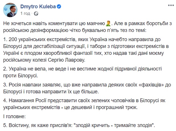 "200 украинских экстремистов, которых Украина якобы направила в Беларусь для дестабилизации ситуации, и лагеря по подготовке экстремистов в Украине являются плодом болезненной фантазии тех, кто предоставил такие данные моему российскому коллеге Сергею Лаврову", - написал Кулеба.