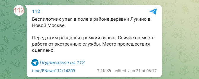 "Беспилотник упал в поле в районе деревни Лукино в Новой Москве. Перед этим раздался громкий взрыв. Сейчас на месте работают экстренные службы. Место происшествия оцеплено", - говорится в сообщении.