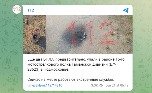 "Еще два БПЛА, предварительно, упали в районе 15-го мотострелкового полка Таманской дивизии (В/Ч 23623) в Подмосковье. Сейчас на месте работают экстренные службы", - пишут в сети.