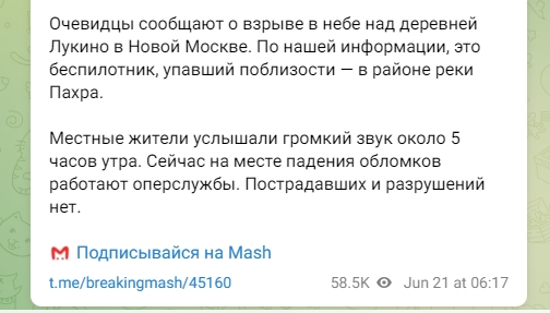 "Очевидцы сообщают о взрыве в небе над деревней Лукино в Новой Москве. По нашей информации, это беспилотник, упавший поблизости - в районе реки Пахра. Местные жители услышали громкий звук около 5 часов утра. Сейчас на месте падения обломков работают оперслужбы. Пострадавших и разрушений нет", - говорится в одном из пабликов.