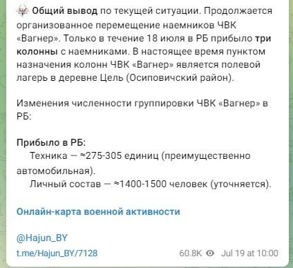 "Общий вывод по текущей ситуации. Продолжается организованное перемещение наемников ЧВК "Вагнер". Только в течение 18 июля в РБ прибыло три колонны с наемниками. В настоящее время пунктом назначения колонн ЧВК "Вагнер" является полевой лагерь в деревне Цель (Осиповичский район). Прибыло в РБ около 275-305 единиц, преимущественно автомобильной, техники. И около 1400-1500 человек личного состава", - отмечается в одном из местных пабликов.