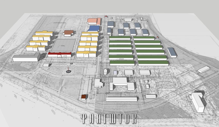 В казарменную зону входят девять 3-х и 4-этажных корпусов. В них можно будет разместить около 3000 солдат. В казарменной зоне по периметру плаца будет размещен штаб воинской части (выделен красным цветом) и столовая.