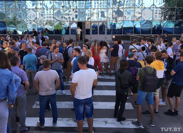 Сотрудники Белтелерадиокомпании присоединились ко всеобщей забастовке в Беларуси в связи с фальсификацией результатов выборов президента. Люди бастуют у здания компании.