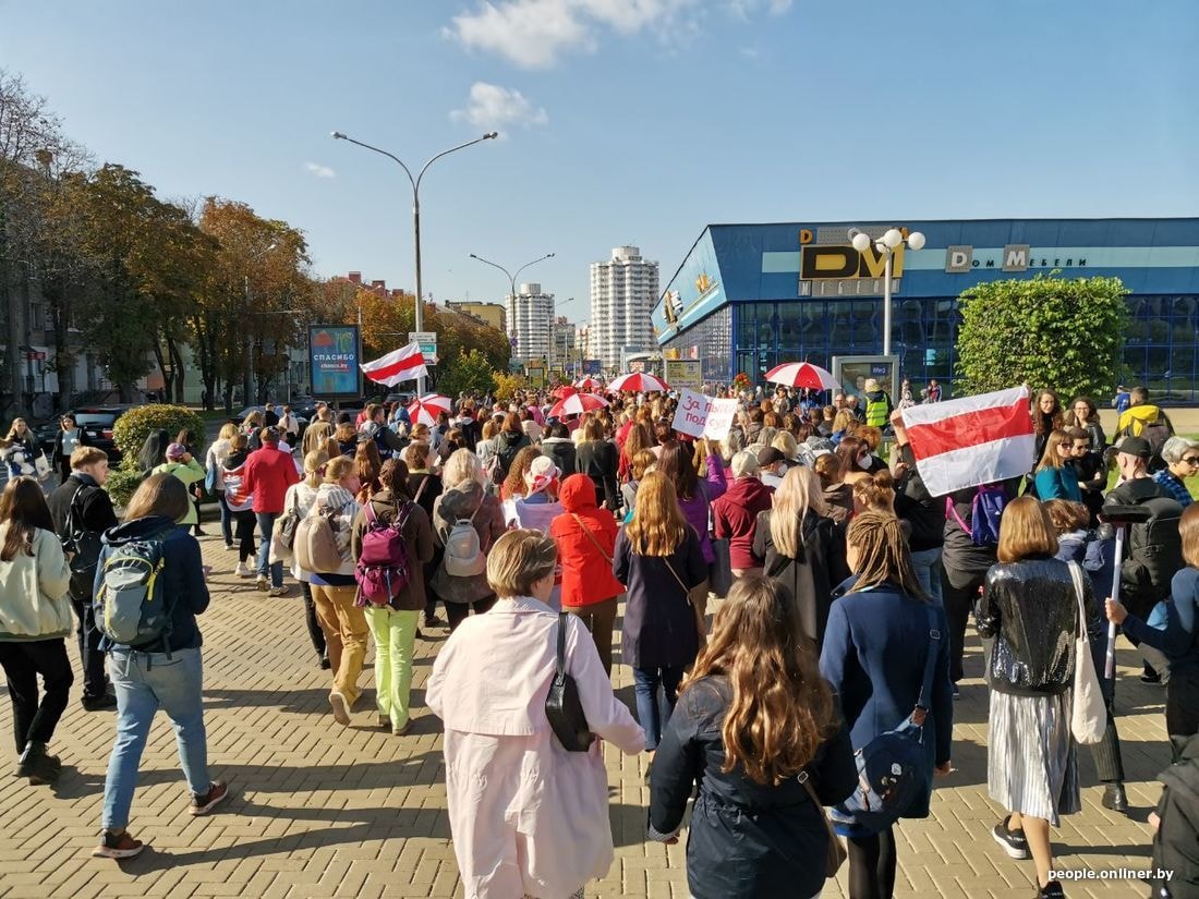 В субботу, 19 сентября, в Минске возле Комаровского рынка собрались участницы традиционного уже в Беларуси женского марша, который был анонсирован как "Блестящий марш". В отличие от предыдущего марша, который запомнился жесткими задержаниями, правоохранительные органы пока не применяют силы к демонстрантам, но автозаки стоят наготове.