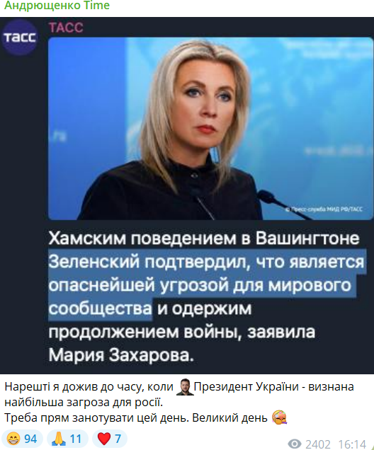 "Наконец я дожил до времени, когда президент Украины - признана самая большая угроза для России. Надо прям записать этот день. Великий день".