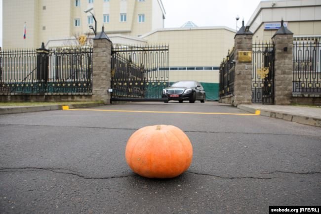 Днем 5 декабря к зданию посольства России в Минске две девушки в национальных костюмах, которым помогал парень, в качестве протеста против объединения Беларуси с Россией принесли тыкву и оставили ее у ворот.