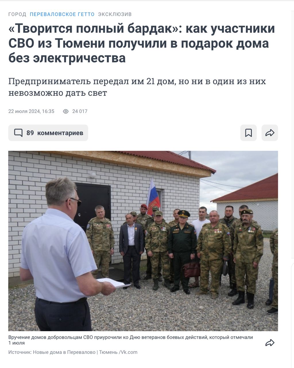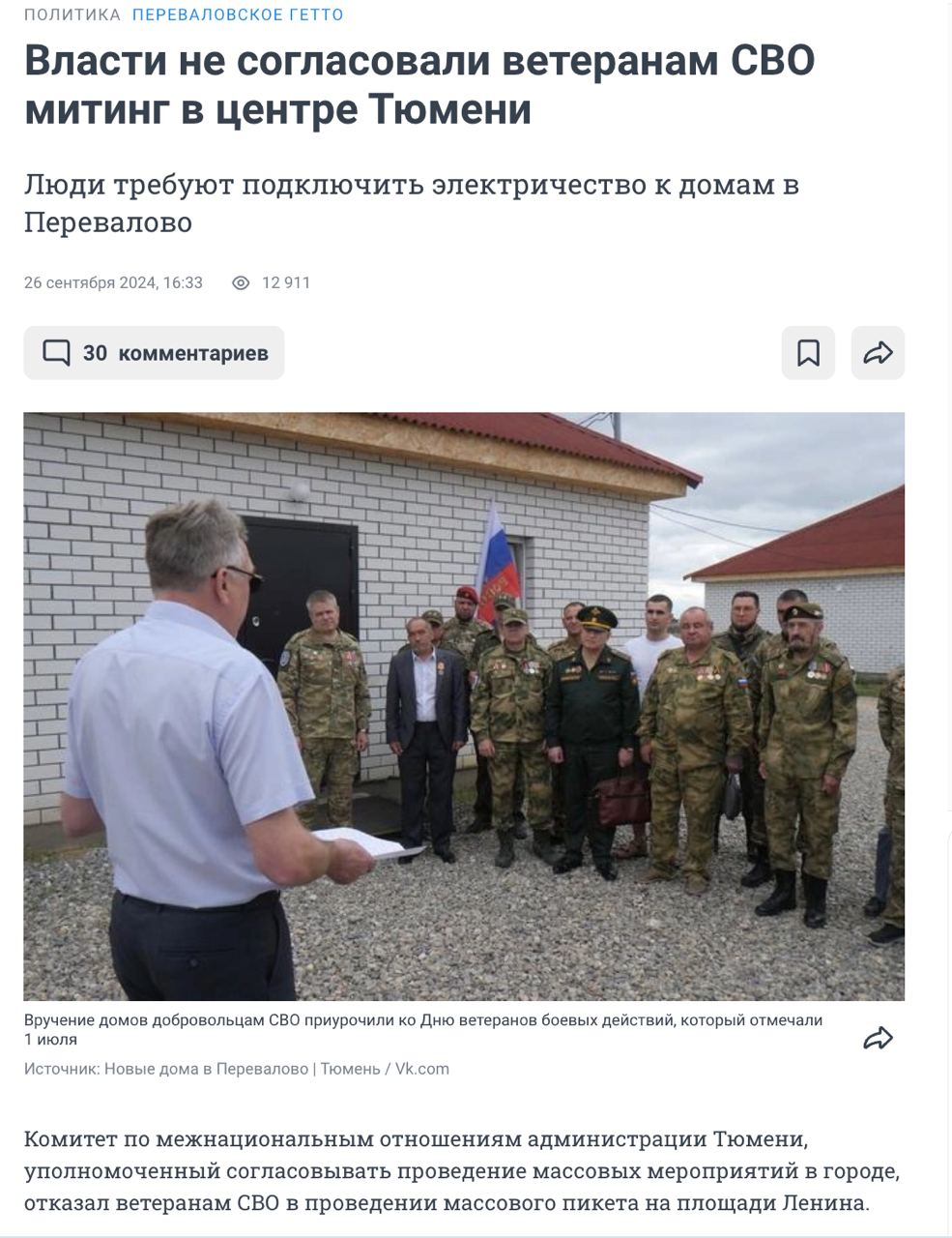 "В Тюмени "ветеранам СВО" подарили дома без электричества. Когда они попытались провести митинг, чтобы потребовать провести им свет, местные власти митинг запретили. Это замечательно. Да, вот за это вы и воевали!", - подчеркнул журналист, добавив кадры из тамошней прессы.