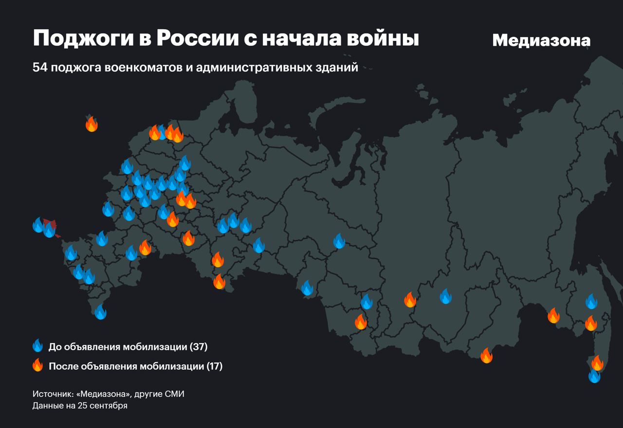 Отмечается, что с начала войны в России подожгли 54 военкомата и административных здания. За пять дней после объявления мобилизации произошло 17 таких случаев.