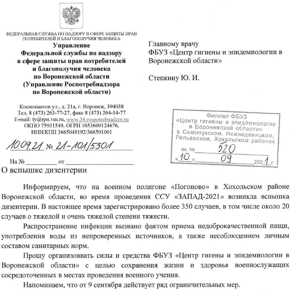 На совместных военных учениях России и Беларуси "Запад-2021", которые проходят на территории двух стран, сотни военнослужащих подхватили дезинтерию. Вспышка заболевания зафиксирована на полигоне "Погоново" в Хохольском районе Воронежской области( РФ).