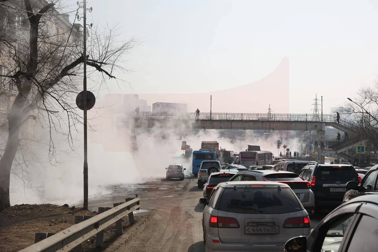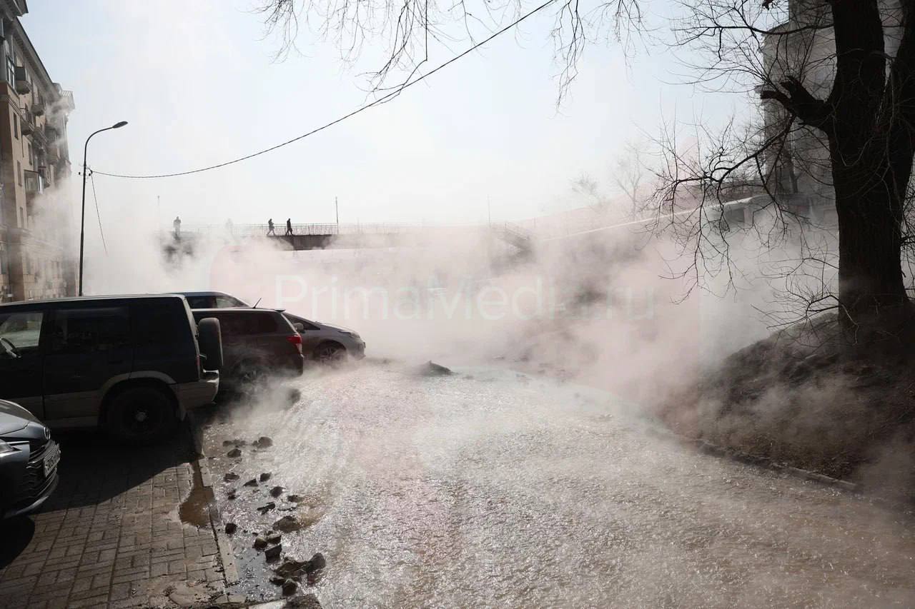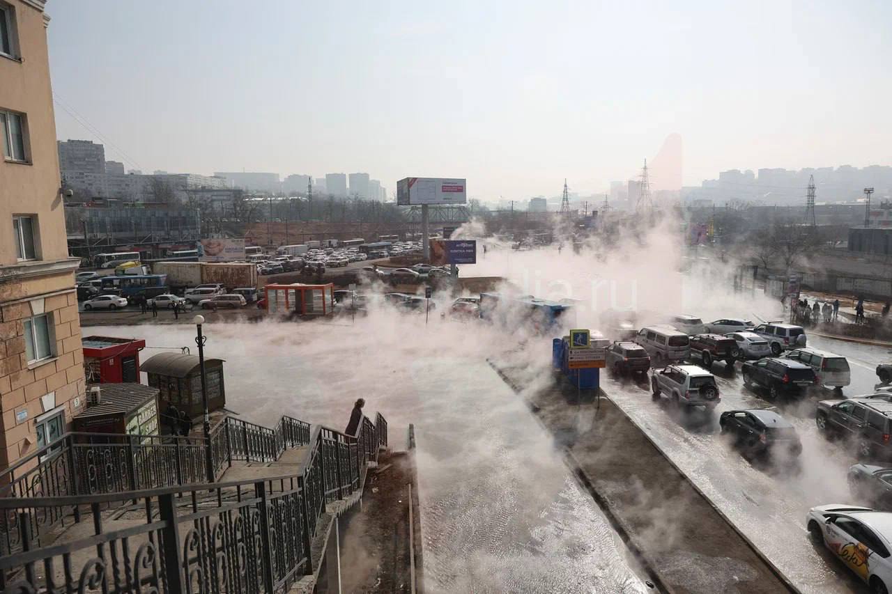 По улицам Владивостока растекается кипяток, который парализовал движение на некоторых участках, а также ограничил видимость до нуля через поднимающийся пар.