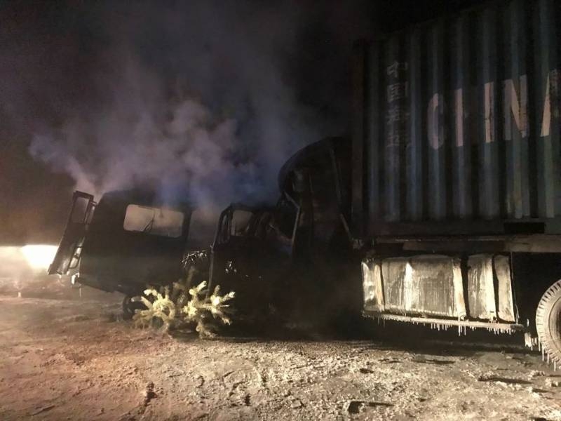 Микроавтобус выехал на встречную полосу движения и столкнулся с грузовиком, после чего "УАЗ" загорелся.