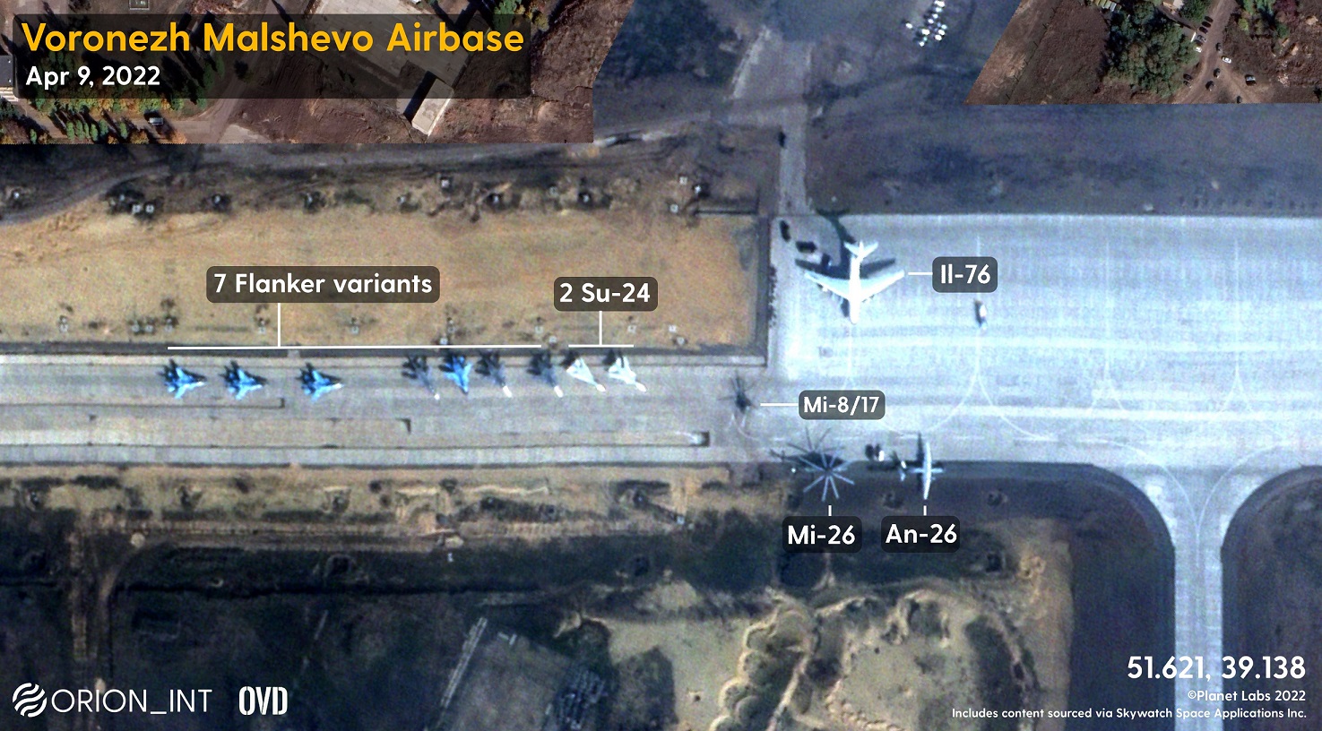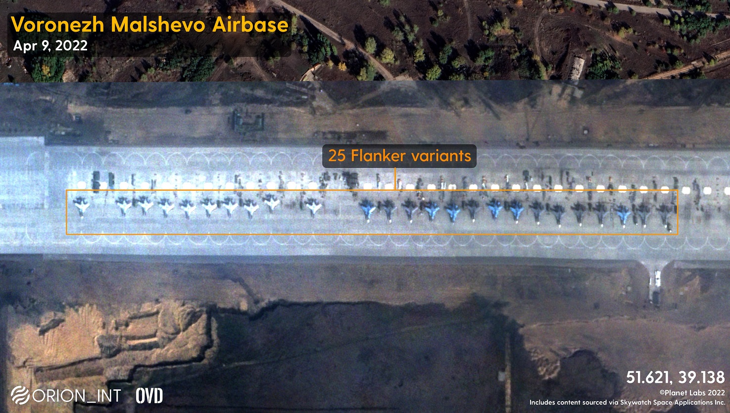 Так, на спутниковых снимках от 9 апреля можно увидеть по меньшей мере 32 истребителя Flanker, среди которых и довольно современные модели – Су-27 и Ил-76. Они дислоцируются на воронежской авиабазе Балтимор.