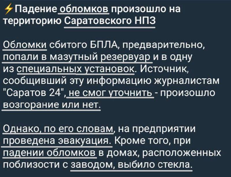 В российском Саратове пожаловались на атаку БпЛА. Местные власти заявили о работе ПВО и классическом "падении обломков", а россияне распространяли видео с возгоранием на местном нефтеперерабатывающем заводе.
