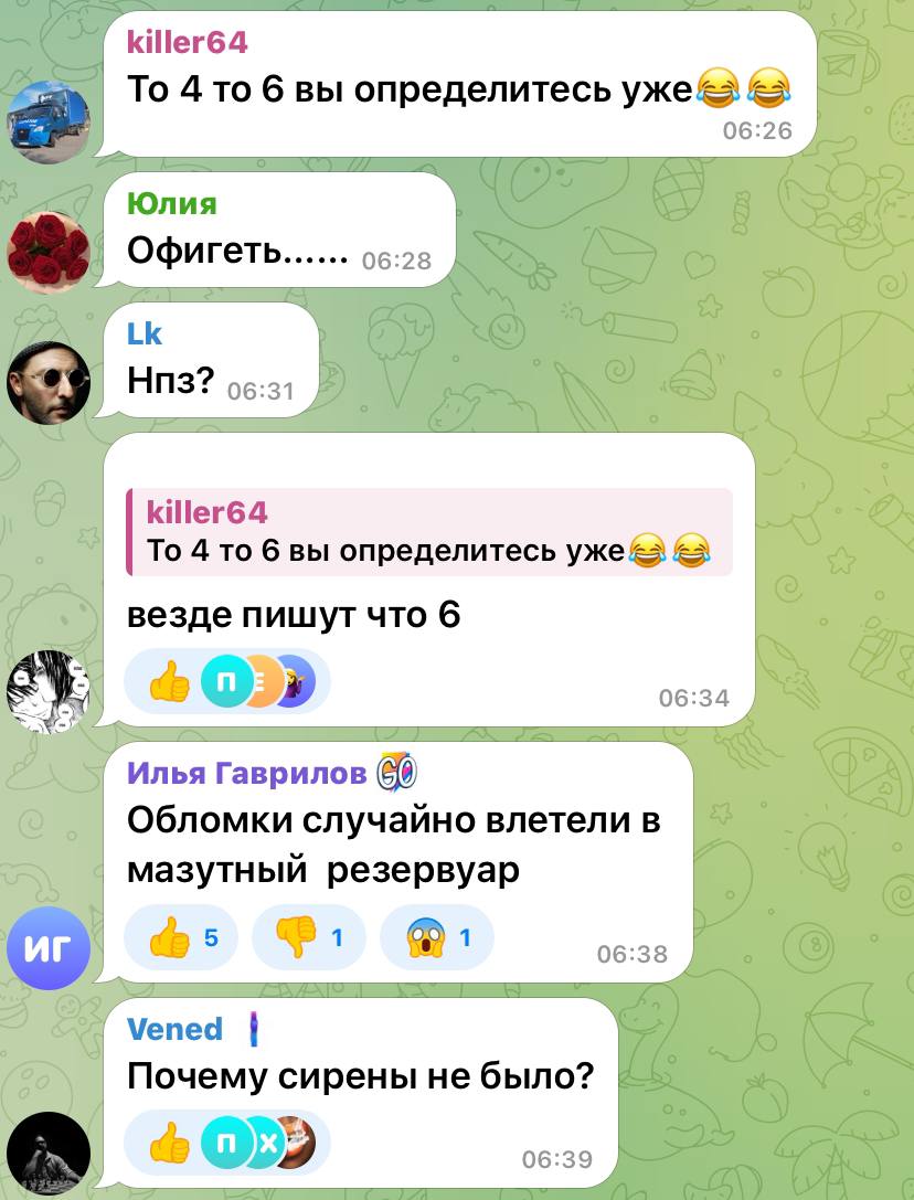 Местные жители писали о том, как им страшно от звуков взрывов. Губернатор Саратовской области отчитывался, что над регионом ночью уничтожили дрон. Однако в промышленной зоне, по его словам Заводского района упали обломки.