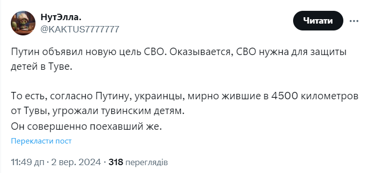По словам кремлевского диктатора, теперь он видит эту "цель" в том, чтобы "защитить детей Тывы". При этом стоит заметить, что Республика Тыва расположена более чем в 4500 км от украинской границы.