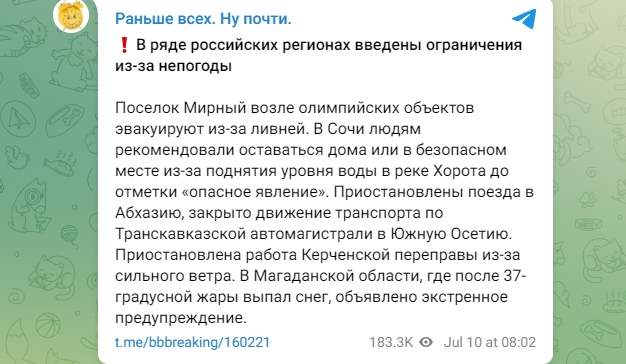 "Поселок Мирный возле олимпийских объектов эвакуируют из-за ливней. В Сочи людям рекомендовали оставаться дома или в безопасном месте из-за поднятия уровня воды в реке Хорота до отметки "опасное явление". Приостановлены поезда в Абхазию, закрыто движение транспорта по Транскавказской автомагистрали в Южную Осетию. Приостановлена работа Керченской переправы из-за сильного ветра. В Магаданской области, где после 37-градусной жары выпал снег, объявлено экстренное предупреждение", - говорится в одном из сообщений.