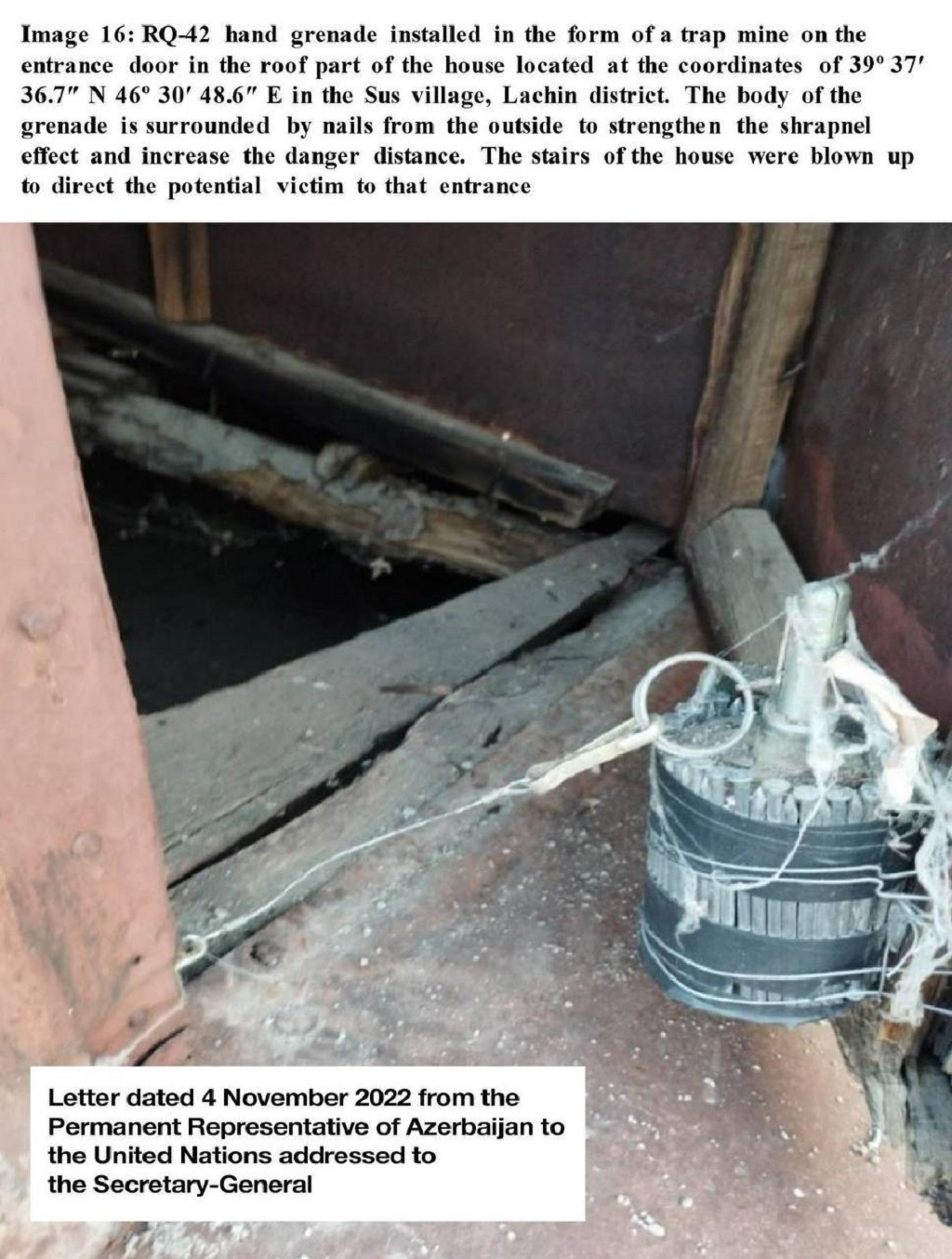 Как заявлял глава МИД Азербайджана Джейхун Байрамов, Армения не только отказывается предоставить полную и точную информацию о минных полях, но и незаконно доставляет в Азербайджан и устанавливает новые мины. Также предоставляются доказательства, что эти мины были сделаны в Армении в 2021 году - после того, как официальный Ереван подписал обязательство о полном прекращении огня и всех военных действий в зоне карабахского конфликта.