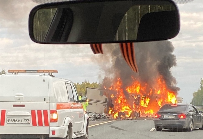В Новгородской области РФ произошло страшное ДТП. У фуры с виноградом прямо на дороге лопнуло колесо, она взорвалась. Никто не пострадал, водитель успел выбежать из кабины.