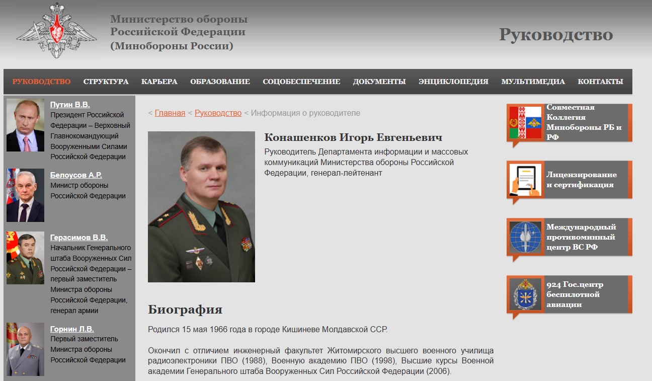 Конашенков, который ежедневно озвучивал военные сводки, уже больше месяца не появляется с видеоотчетами от минобороны. При этом на сайте ведомства он все еще указан как глава пресс-службы.