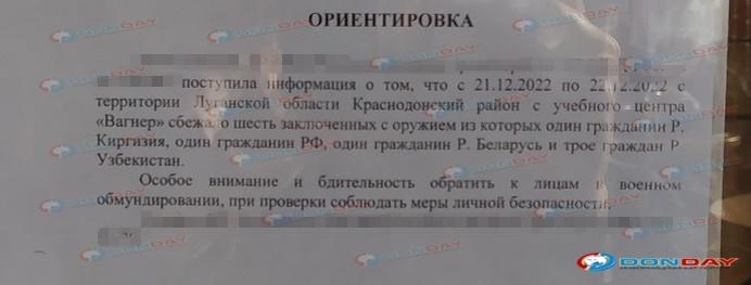 В Ростове-на-Дону размещают ориентировки на шестерых вооруженных заключенных бойцов, сбежавших из учебки ЧВК "Вагнера" в Краснодонском районе Луганской области.