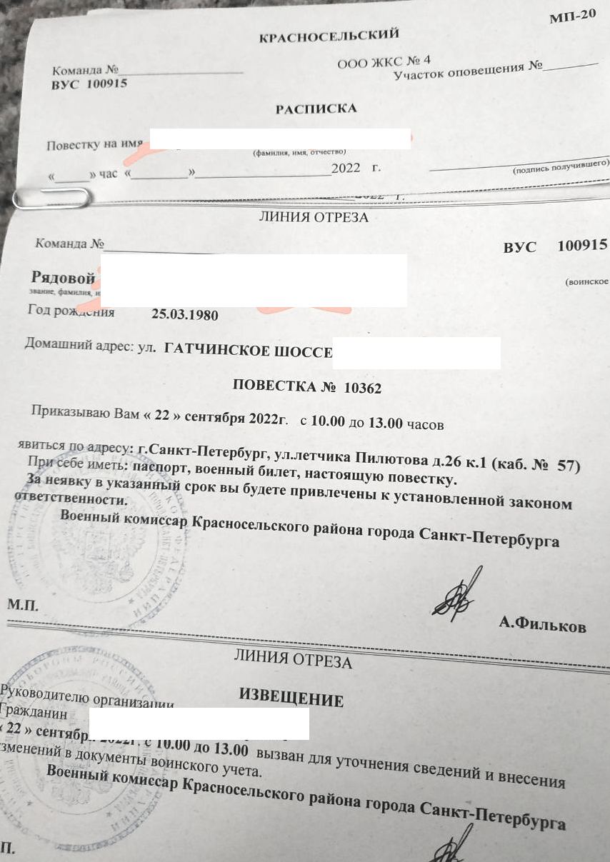 Так, повестки массово вручают в Санкт-Петербурге, а в Москве повестки из военкоматов для вручения мобилизационного предписания получают многие медики.
