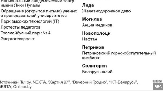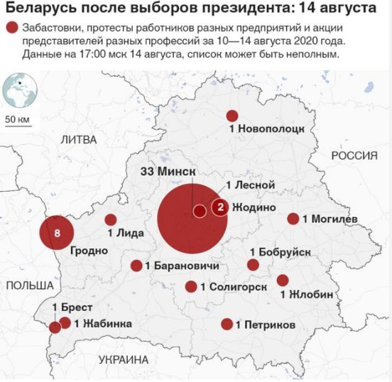 В сети появилась карта, на которой показаны места, где 14 августа проходили протесты и краткосрочные забастовки.