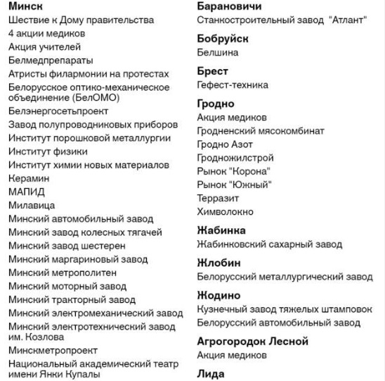 Кроме этого, в этот день одно за другим промышленные предприятия Беларуси объявляли о забастовке, требуя прекратить насилие со стороны государства и провести честные выборы.