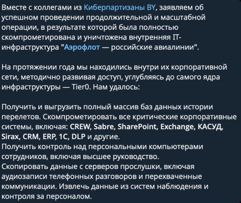 Авиакомпания "Аэрофлот" отменила почти 50 пар рейсов в и из Москвы из-за сбоя информационных систем. В то же время хакерские группировки Silent Crow и "Киберпартизаны BY" заявили о взломе и уничтожении IT-инфраструктуры компании.