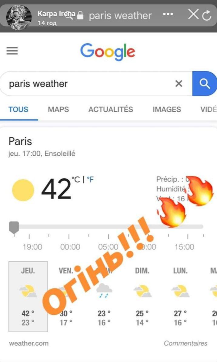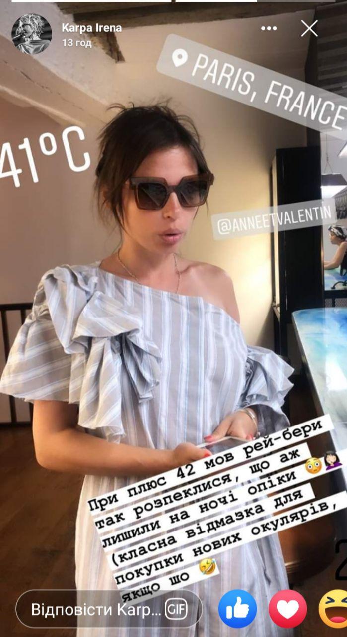 Украинская певица и писательница Ирена Карпа рассказала о невероятной жаре в Париже, и поделилась подтверждающими фото.