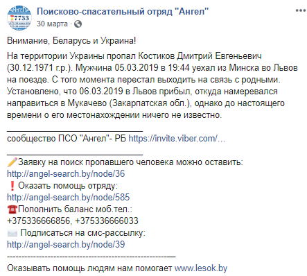 Соответствующая информация была размещена на странице поисково-спасательного отряда "Ангел" 30 марта, вместе с объявлением о пропаже мужчины.