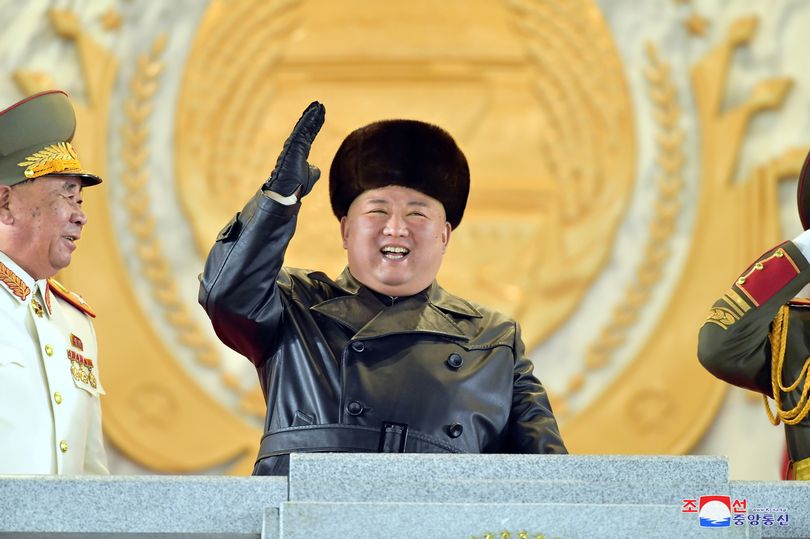 Северокорейский диктатор Ким Чен Ын, одетый в кожаное пальто и меховую шапку, улыбался и махал рукой, наблюдая за парадом.