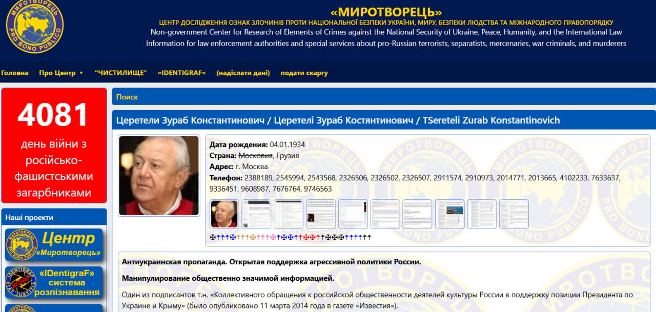 В частности, Церетели внесли в украинский сайт и общественную организацию, которая исследует признаки преступлений против национальной безопасности Украины, мира, безопасности человека и международного права, за антиукраинскую пропаганду.