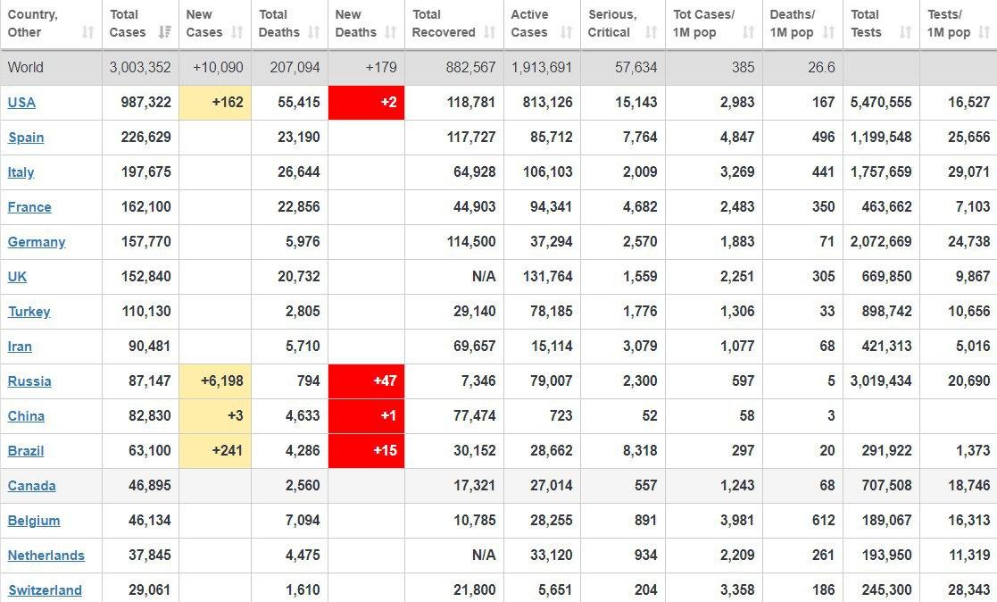 По состоянию на 11:45 COVID-19 подтвержден у 3 003 392 людей по всему миру.