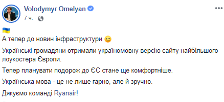 "А теперь к новостям инфраструктуры Украинские граждане получили украиноязычную версию сайта крупнейшего лоукостера Европы. Теперь планировать путешествие в ЕС станет еще комфортнее. Украинский язык - это не только красиво, но и удобно. Спасибо команде Ryanair!" - написал Омелян.