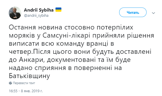 "Последняя новость о пострадавших моряках в Самсуне – врачи приняли решение выписать всю команду утром в четверг. После этого они будут доставлены в Анкару, документированы, и им будет оказано содействие в возвращении на Родину", - написал посол.
