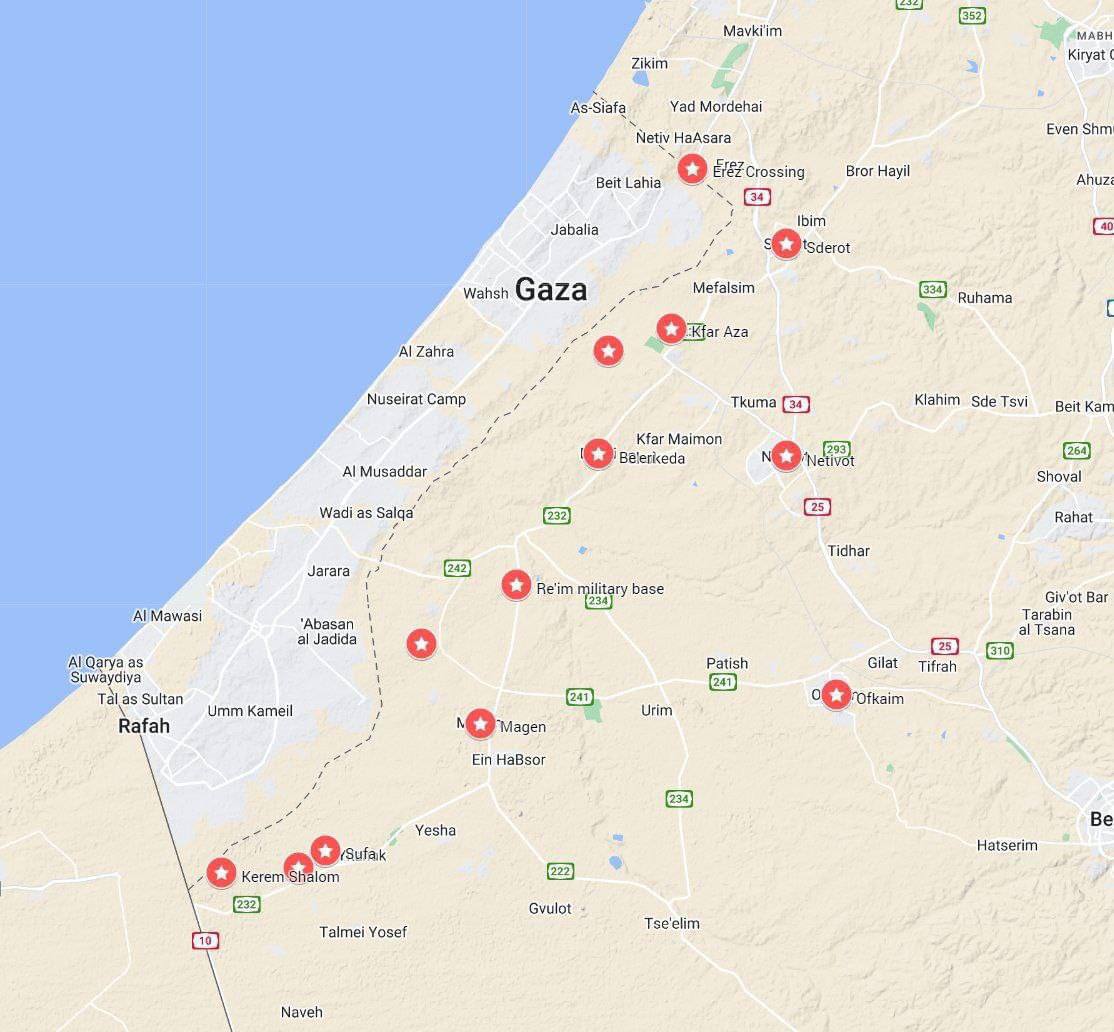 Кроме того, Israel News разместили на своем аккаунте в Twitter карту с указанием мест, куда удалось проникнуть ХАМАС. На данный момент бои идут в семи поселениях Израиля.