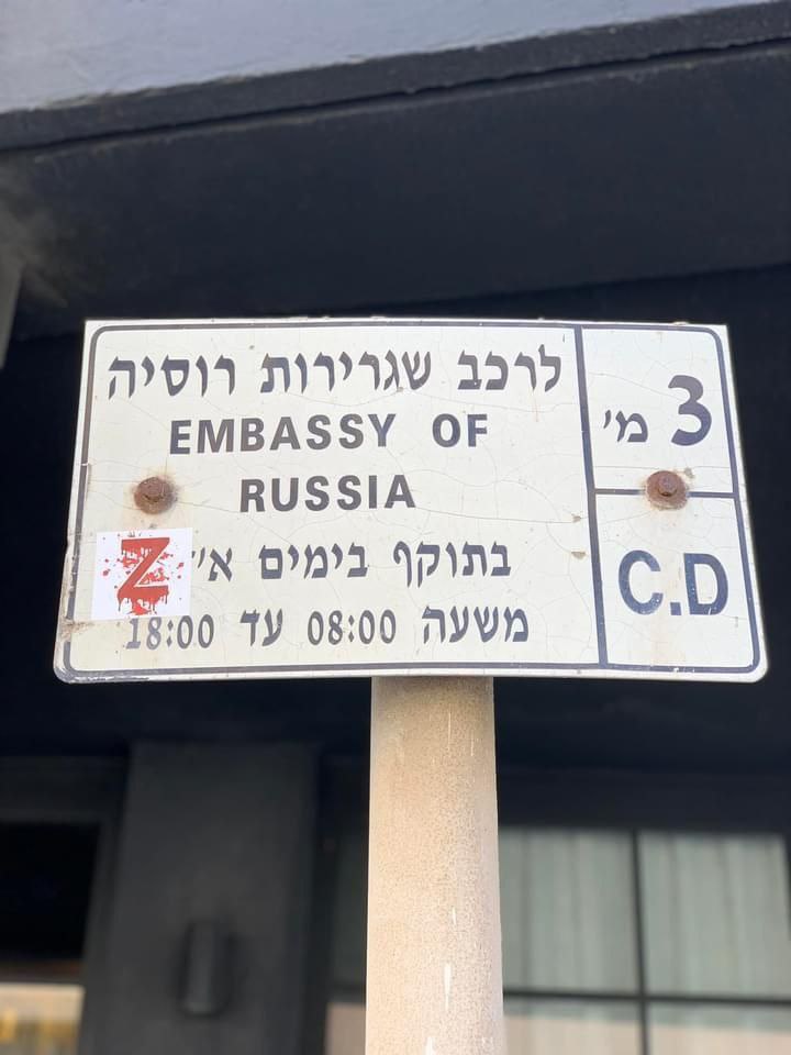 В среду, 23 мерта, израильские активисты в Тель-Авиве оставили "кровавые метки" в виде нацистского знака "Z" на автомобилях послов из Российской Федерации.